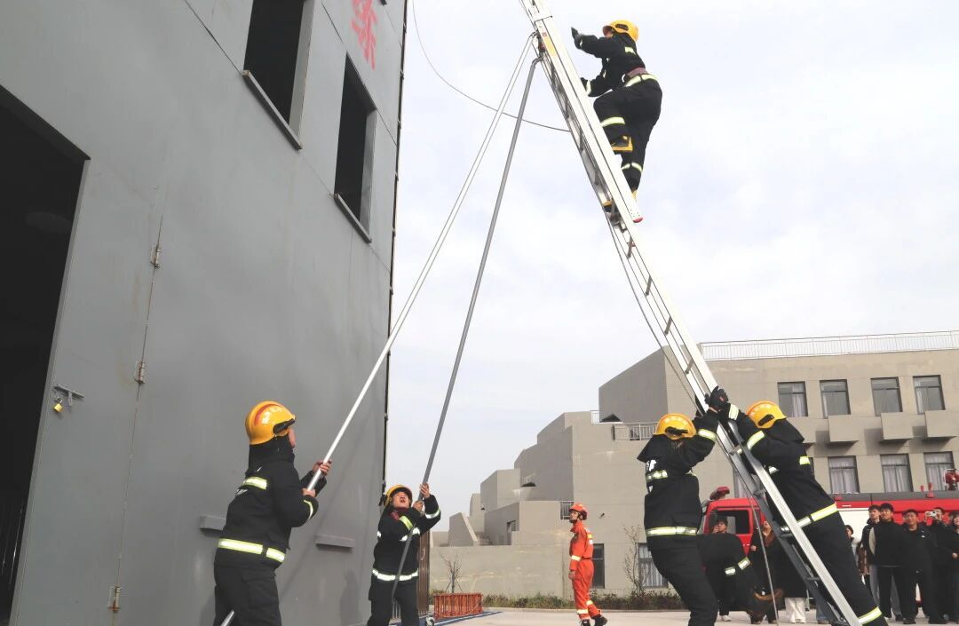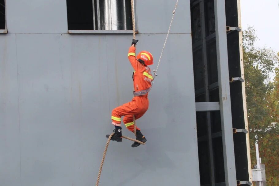 演练结束后,武安市消防救援大队官兵身着专业装备,给消防救援专业师生进行了极具专业度的技能展示。队员们协作架设十五米金属拉梯登楼,动作紧凑、配合默契,每一处支点的固定都体现着救援战术的严谨性;爬绳攀爬环节,消防员借助专业装备沿绳而上,整套动作遵循救援技术规范,展现出高空救援的专业素养;沿拉梯铺设消防水带演示更是将灭火实战中的 “快速控火” 要求直观呈现,让师生对消防装备操作有了深入认知。
