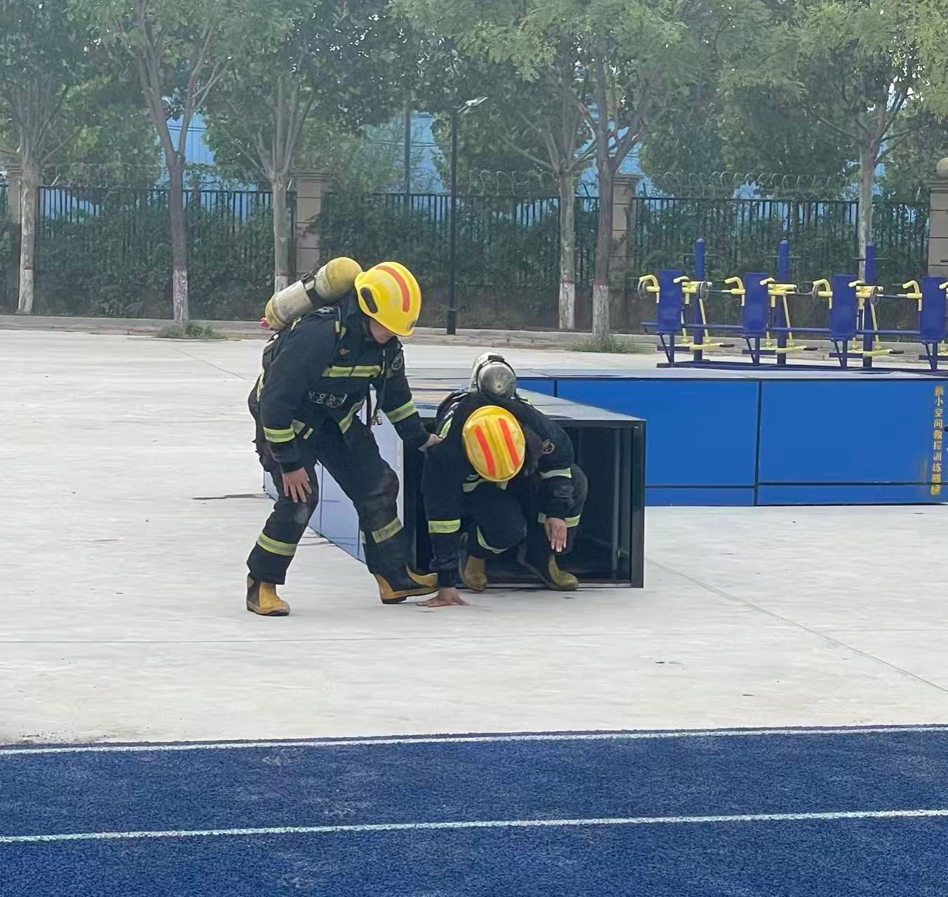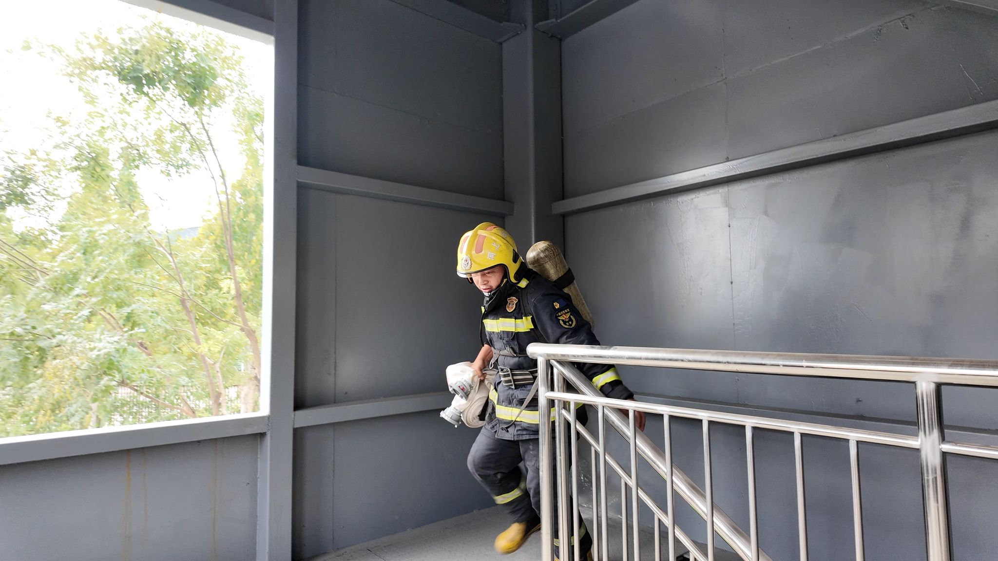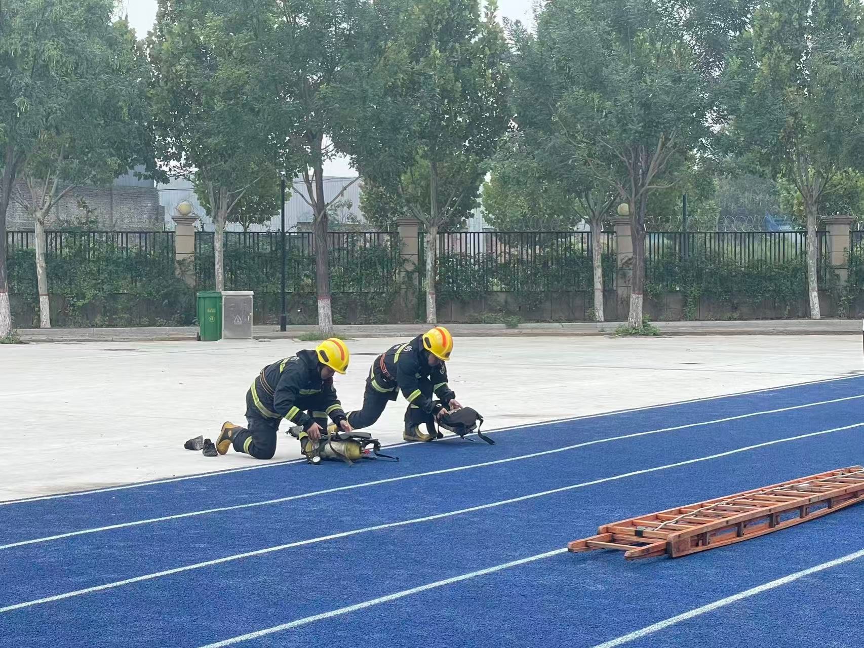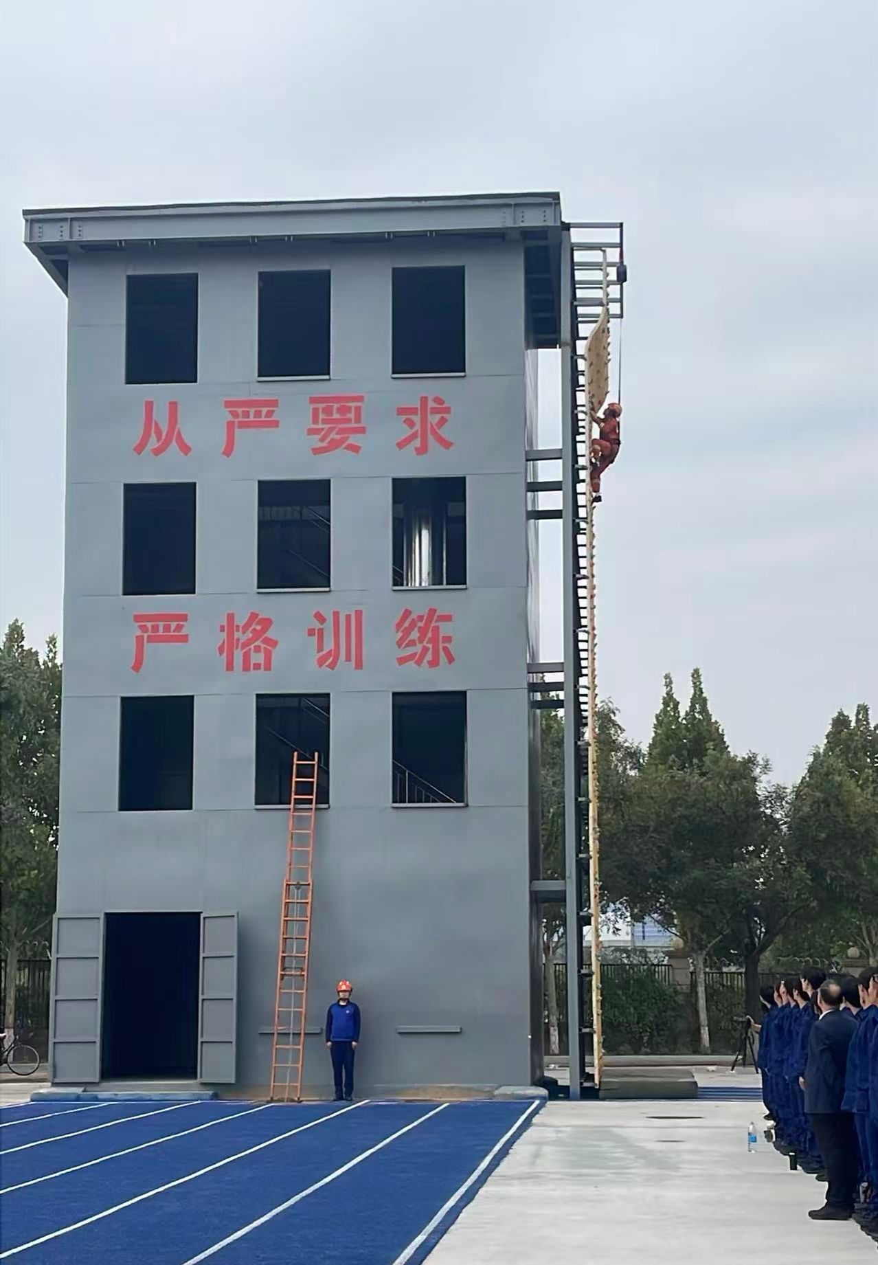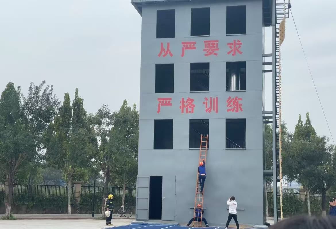 本次演练工作共设置五个科目,由专业教师依次示范:科目一原地着装、科目二黑暗搜索,由张振、王宗耀完成,模拟复杂环境下的快速响应与搜救能力;科目三负重四楼,由赵红南携装备完成楼层攀爬,展现应急场景下的体能与耐力;科目四两人拉梯,由安建磊、王超配合搭建救援梯道,凸显团队协作的重要性;科目五攀岩,由孙章勇示范高空攀爬技巧,为后续新生体验做专业引导。