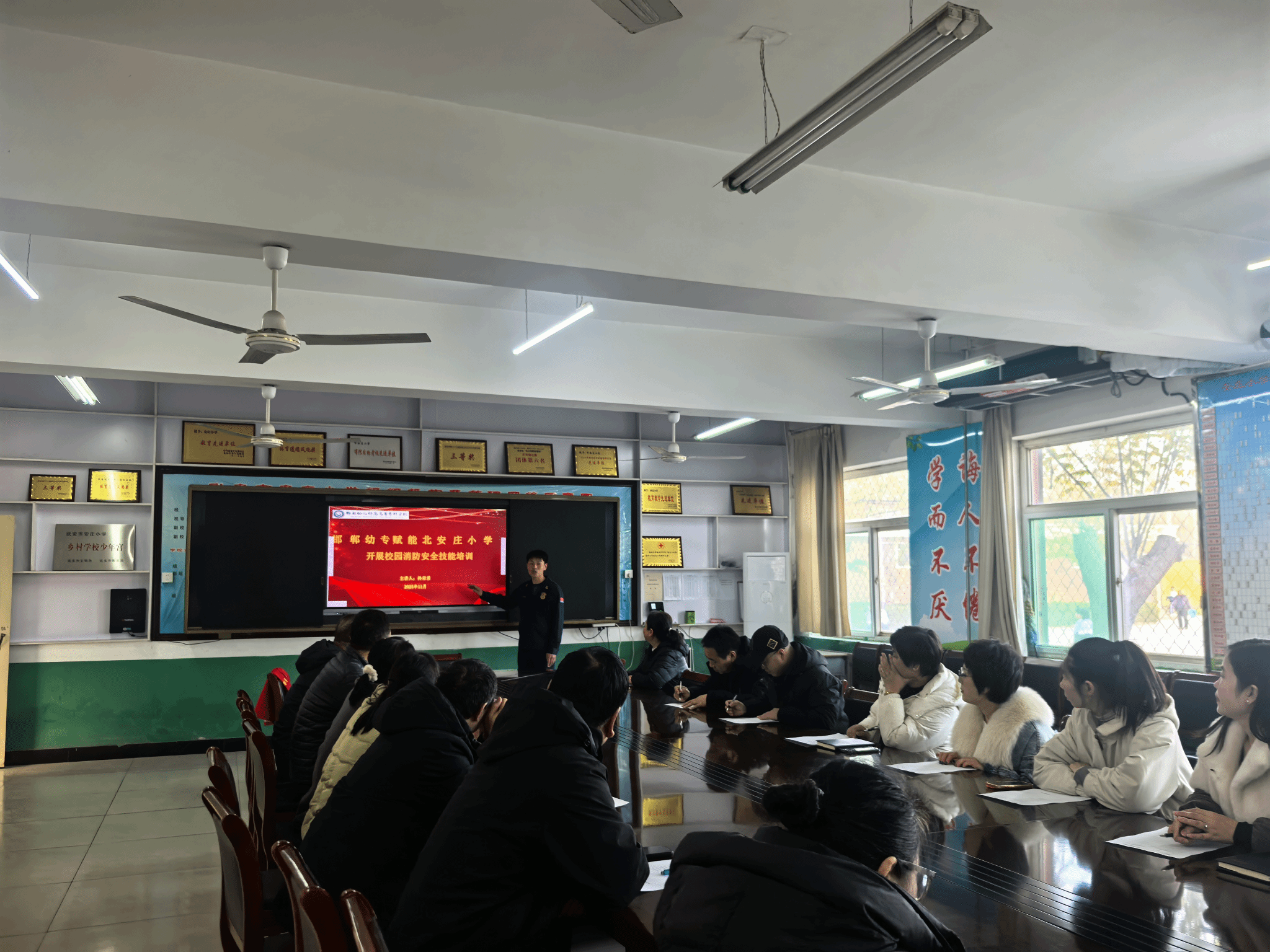 11月20日下午,邯郸幼儿师范高等专科学校体育系教师宋贺华、应急管理系副主任段青青、教师孙章勇、学生代表韩智蕾一行,前往武安市北安庄小学开展消防知识专题培训。本次培训由段青青副主任主持并统筹组织,孙章勇老师担任主讲,北安庄小学共35名教职工参与学习。活动旨在通过系统讲解与实操演练,进一步提升小学教师的消防安全意识与应急处理能力,筑牢校园安全防线。