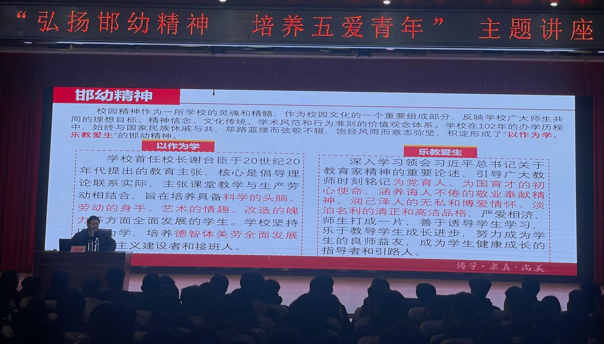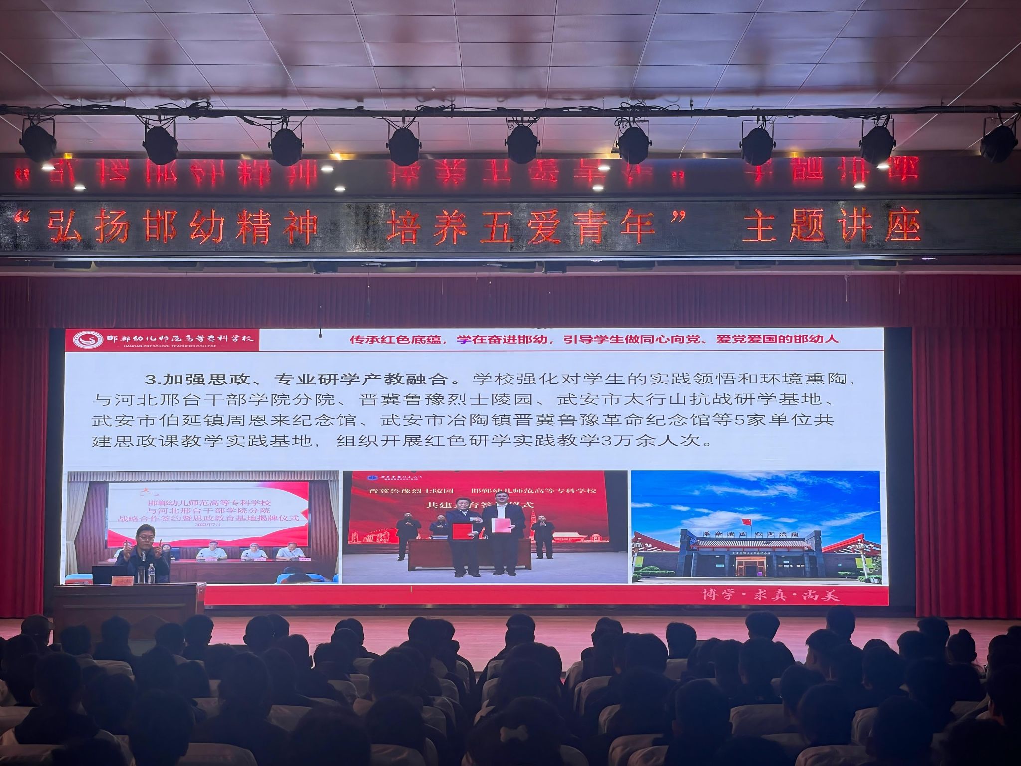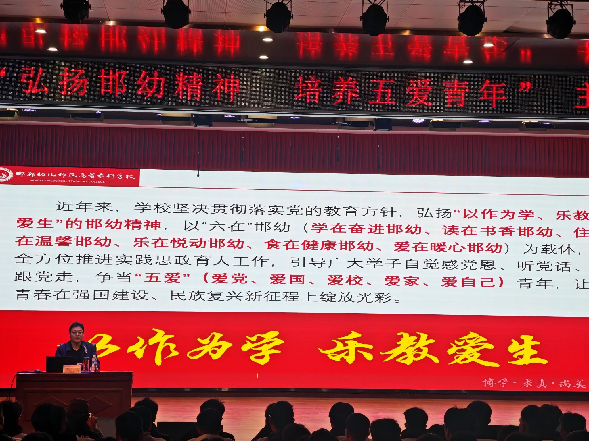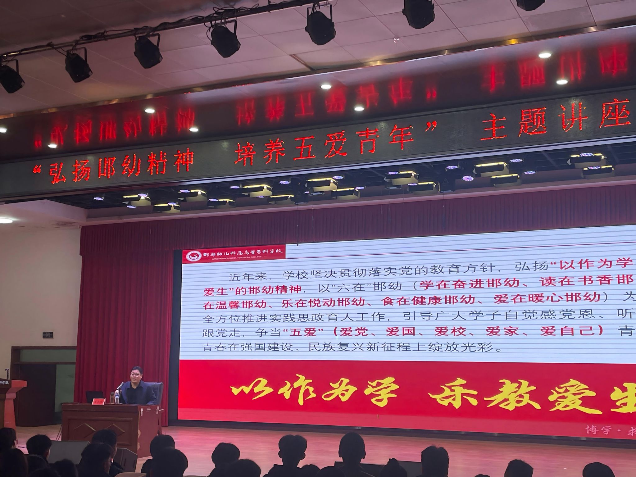 讲座中,万书记以深厚的理论素养、丰富的经验和广阔的行业视野,系统阐释了“邯幼精神”的历史渊源、核心内涵与时代价值。他结合学校深耕职业教育的办学历程,紧扣消防救援行业“对党忠诚、遵规守纪、赴汤蹈火、竭诚为民”的训词精神,对“爱党、爱国、爱校、爱家、爱自己”的“五爱”青年标准作出深度解读。爱党爱国是消防救援人员的立身之本,要始终把忠诚于党、报效国家作为最高政治原则,将个人理想融入国家应急管理事业发展大局;爱校是荣校之基,要以校为家、珍惜学习平台,在专业实训中锤炼本领,以优异成绩为学校争光;爱家是责任之始,要传承优良家风、涵养家国情怀,将对家人的牵挂转化为守护人民群众生命财产安全的强大动力;爱自己是成长之要,要锤炼过硬身体素质与专业技能,塑造坚韧意志和健全人格,为应对急难险重任务筑牢自身根基。