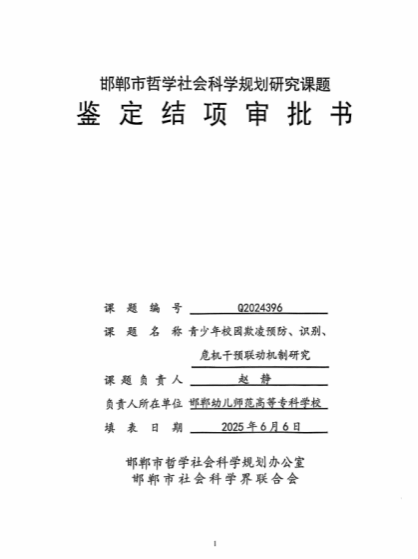 15 | 2025 | 赵静 | 青少年校园欺凌预防、识别、危机干预联动机制研究 | 课题 | 邯郸市哲学社会科学规划研究课题 | 市级 | 已结项 |