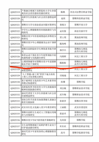 8 | 2025 | 赵静 | 家庭教育对中职生自我同一性发展滞后的影响研究 | 课题 | 团省委冀青调研课题 | 省级 | |