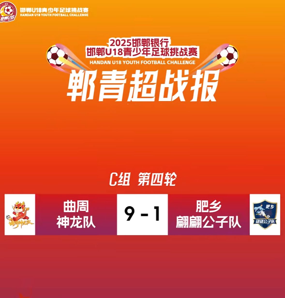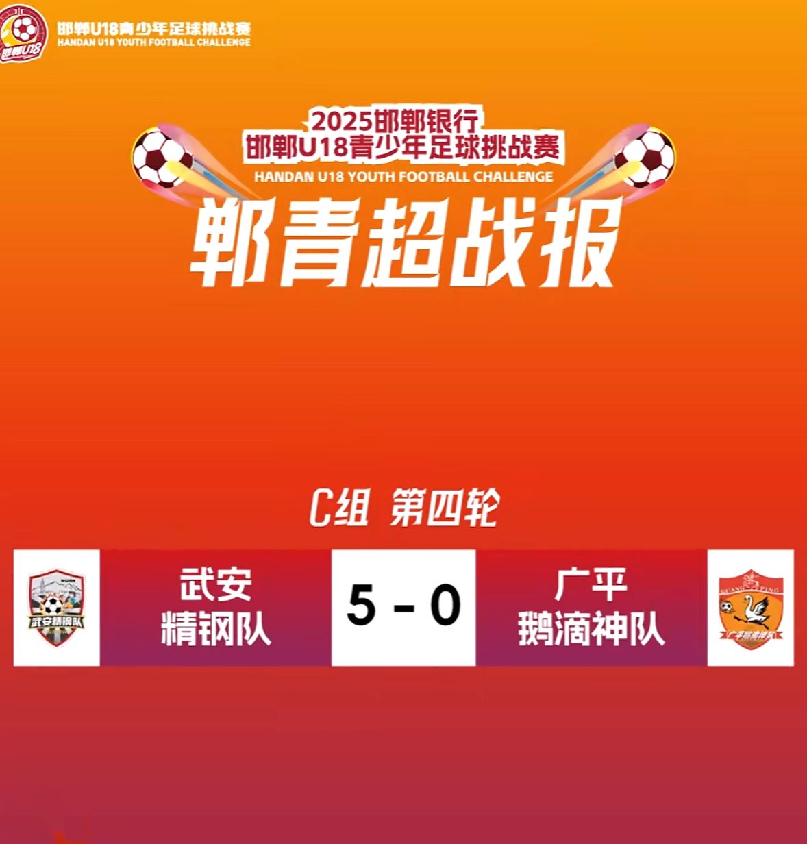 随着终场哨响,足球赛胜负揭晓,得分情况为武安精钢队 5:0 广平鹅滴神队,肥乡翩翩公子队 1 : 9 曲周神龙队。这场U18青少年足球挑战赛,不仅是足球技艺的较量,更是青春精神的绽放。