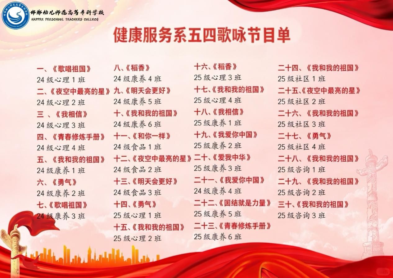 24康养2班斩获第一名,25心理1班荣获第二名,24心理4班拿下第三名,25心理2班、25康养5班、25社区4班分别获得第四至第六名,获奖班级用实力诠释青春担当,以歌声唱响时代热爱,每一份佳绩都凝聚着全体同学的团结协作与日夜汗水,每一份荣光都彰显着邯幼学子昂扬向上的精神风貌与蓬勃力量。
