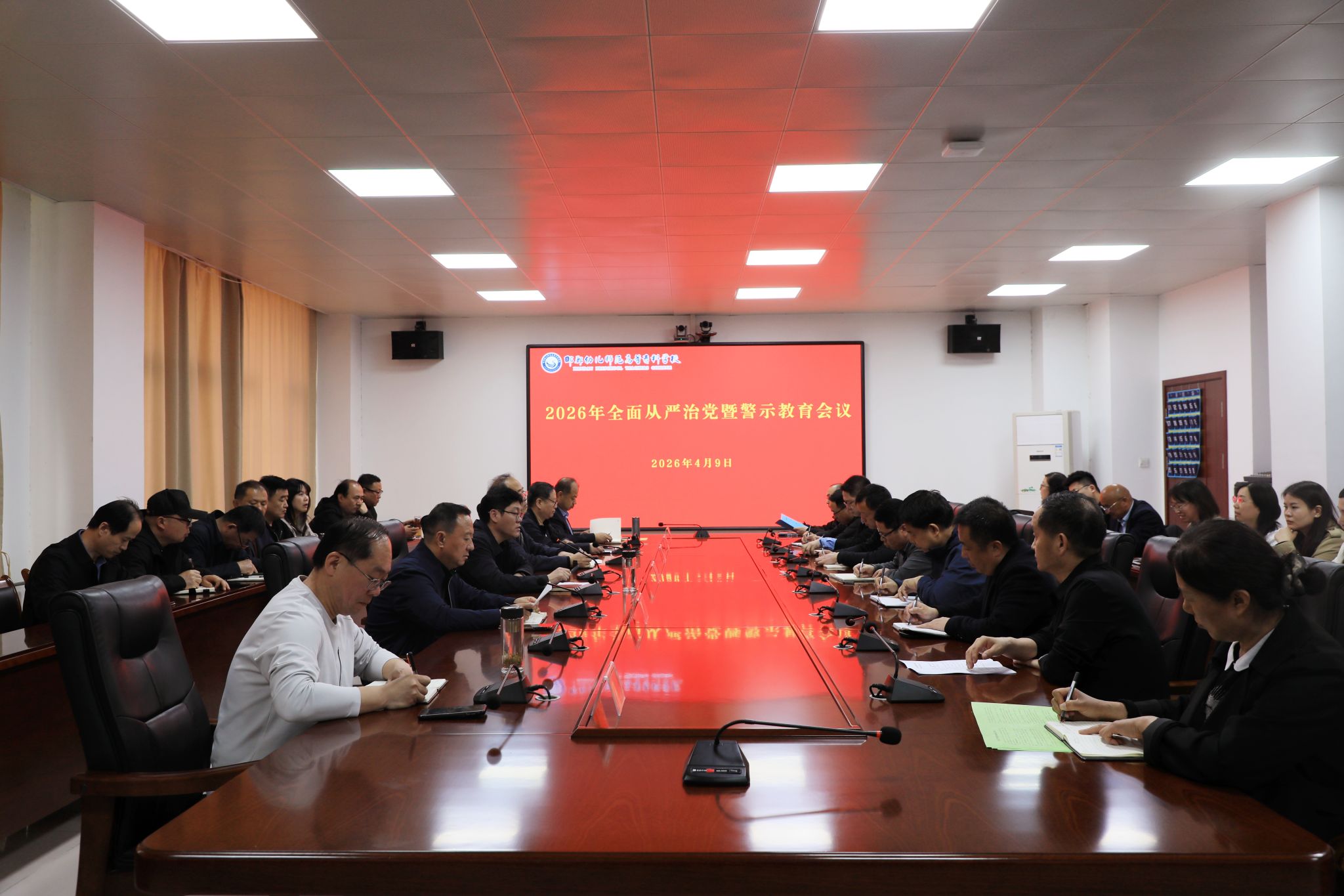 4月9日下午,我校召开2026年全面从严治党暨警示教育会议,深入学习贯彻习近平总书记在二十届中央纪委五次全会重要讲话精神,深入学习贯彻习近平总书记关于全面从严治党重要论述,校党委书记万永彪出席并讲话,校党委副书记、校长曹建召主持会议,学校领导班子其他成员、全体中层干部参加。